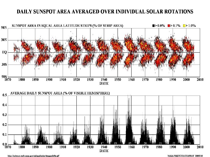 Sunspots • magnetic elements • Every ~11 years the number of sunspots seen on the Sun increases from ~0 to ~100, then decreases to ~0 again as the next cycle starts • The polarity is reversed also • So a complete sunspot cycle is ~22 years • Seen in a band, 5 -40˚ latitude above and below the solar equator
