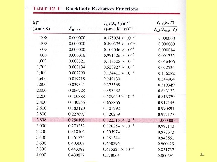The Stefan-Boltzmann Law and Band Emission • The total emissive power of a blackbody is obtained by integrating the Planck distribution over all possible wavelengths. the Stefan-Boltzmann law, where • The fraction of total blackbody emission that is in a prescribed wavelength interval or band is where, in general, and numerical results are given in Table 12. 1 20