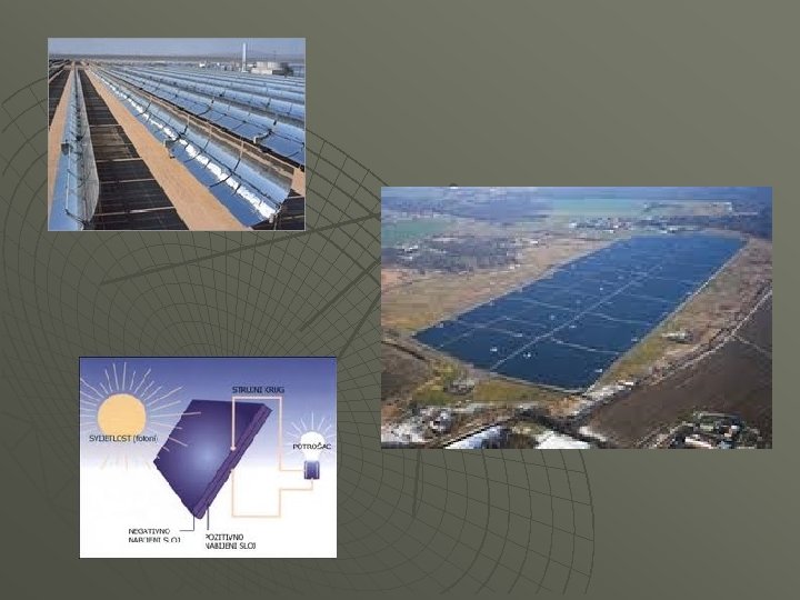 KOLEKTORI ZA PROIZVODNJU EL. ENERGIJE Solarne termalne elektrane ili sunčeve termoelektrane su izvori električne struje dobivene pretvorbom Sunčeve energije u toplinsku (za razliku od fotovoltaika kod kojih se električna energija dobiva direktno). S obzirom da nemaju štetnih produkata prilikom proizvodnje električne energije, a imaju razmjernu dobru efikasnost (20 - 40%), proriče im se svjetla budućnost.