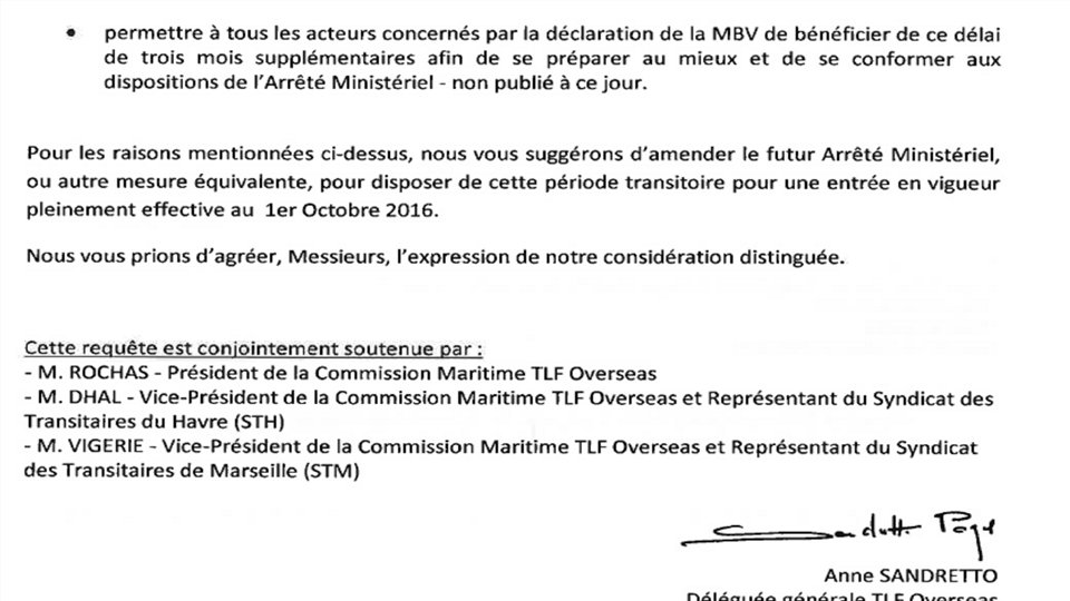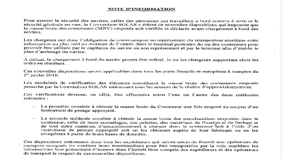 SOLAS : Note d’information à destination des donneurs d'ordre - exportateurs Nous précisons aux adhérents qu’il est nécessaire d’informer les clients (les donneurs d’ordre) exportateurs à propos de l’application prochaine de la réglementation SOLAS sur la déclaration de la Masse Brute Vérifiée (MBV) des conteneurs. En effet le commissionnaire de transport doit remplir son obligation légale d’information selon l’article 5. 4. 3 du contrat-type: « le commissionnaire de transport est tenu d’informer le donneur d'ordre des réglementations relatives au transport du ou des Etats concernés par le déplacement des marchandises ainsi que des conventions internationales afférentes au transport à réaliser » . La Réglementation SOLAS sur la déclaration de la MBV est une convention internationale relative aux transports de tous les conteneurs par voie maritime à partir du 1 er juillet 2016. Informer sur les dispositions de cette Convention SOLAS est donc indispensable.