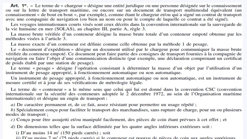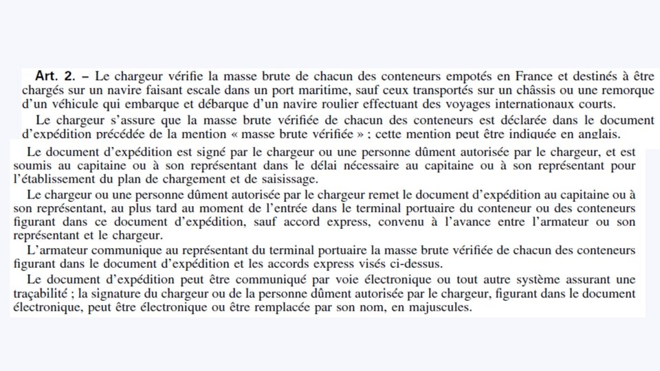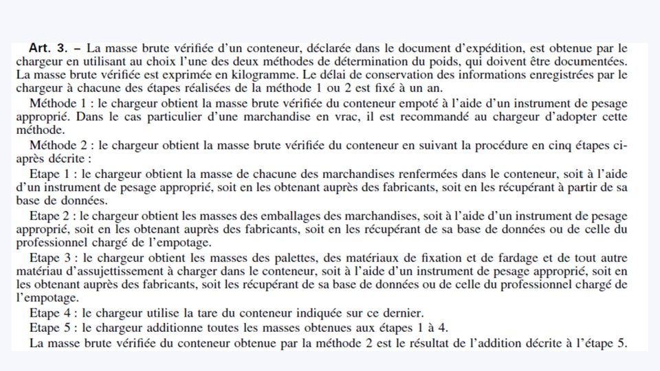 Organisation du passage portuaire Exportateur VGM Commissionnaire de Compagnie Maritime Terminal Maritime Transport AMQ CBK VGM AMQ + VGM Menu Chargeur Transporteur ATTENDU RDV 30 Bon à Charger RECEPTi. ON VU A BORD