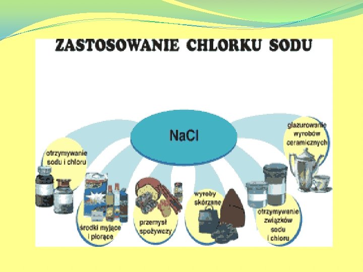 Chlorek sodu Na. Cl (sól kuchenna) Stanowi podstawowy składnik soli kuchennej, soli warzonej oraz soli drogowej. W przyrodzie chlorek sodu występuje pod postacią minerału –halitu, tworząc pokłady soli kamiennej. Występuje również w wodzie morskiej oraz w wodach mineralnych (najwięcej w tzw. solankach).