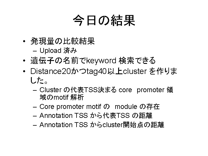 co-existence of binding motif in core promoter region (TATA, INR, DPE, MTE) Rep. TSS # 0000 18, 600 0001 505 0010 403 0100 320 1000 652 1100 22 1010 21 1001 18 0110 18 0101 10 0011 12 0111 0 1011 1 1110 0 1101 1 1111 0 Here 0, 1 express, the present and absent of each motif elements in written order