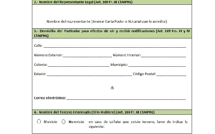 Art. 169 I. El número de folio o de registro de la solicitud de acceso; II. El sujeto obligado ante la cual se presentó la solicitud; III. El nombre del solicitante que recurre o de su representante, y en su caso, el nombre o razón social del tercero interesado, así como la dirección o medio que señale para recibir notificaciones; IV. El domicilio o medio electrónico del particular y del tercero interesado, si lo hubiera, para efectos de oír y recibir notificaciones; en caso de no haber señalado el particular, aún las de carácter personal se harán por tabla de avisos;