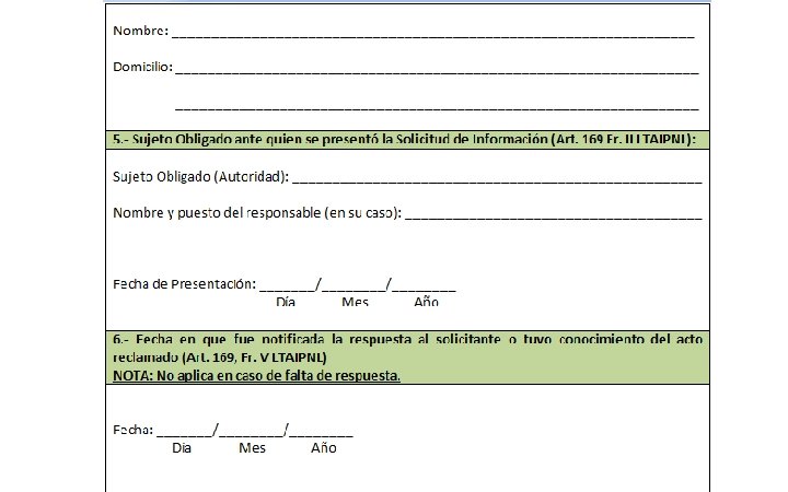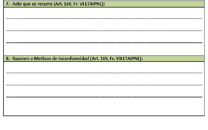 V. La fecha en que fue notificada la respuesta al solicitante o tuvo conocimiento del acto reclamado, o de presentación de la solicitud, en caso de falta de respuesta; VI. El acto que se recurre; VII. Las razones o motivos de inconformidad; y VIII. La copia de la respuesta que se impugna y, en su caso, de la notificación correspondiente, salvo en el caso de respuesta de la solicitud.