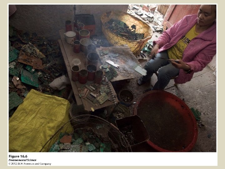 E-waste • Electronic waste including televisions, cell phones, computers, DVD players and other electronic devices – Hazardous waste! • Contains POPS: PVCs (polyvinylchloride), PBBs (polybrominated flame retardants), • Heavy metals: lead, mercury, cadmium, chromium, etc – If disposed in landfill, these hazardous chemicals are released in air, water and soil – E-waste must be collected so the hazardous materials can be removed and recycled: US recycles 20% Switzerland recycles 80% – US produces half world’s e-waste