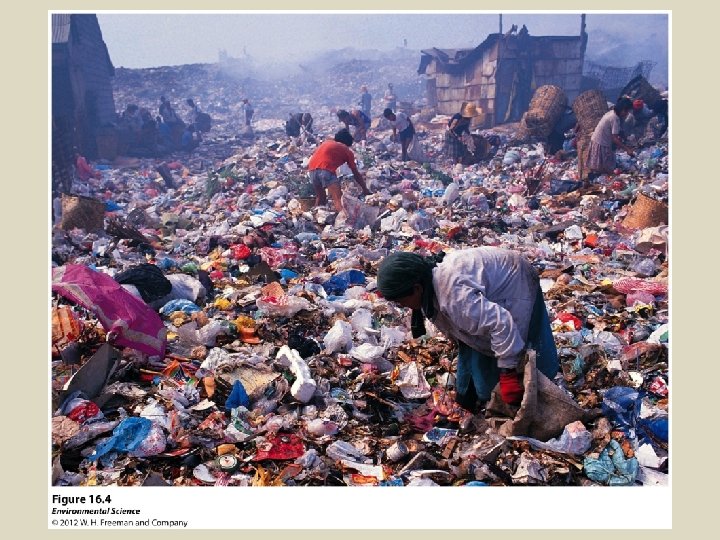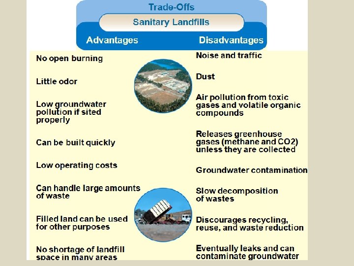 When landfill is full, layers of soil and clay seal in trash Electricity generator building Sanitary Landfill: Methane storage and compressor building Topsoil Sand Leachate treatment system Clay Garbage Methane gas recovery Pipe collect explosive methane gas used as fuel to generate electricity Leachate storage tanks Compacted solid waste Groundwater monitoring well Leachate pipes Garbage Sand Synthetic liner Sand Clay Subsoil Leachate pumped up to storage tanks for safe disposal Groundwater Clay and plastic lining to prevent leaks; pipes collect leachate from bottom of landfill