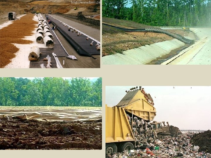 Constructing a Landfill • http: //polaris. umuc. edu/cvu/envm/02 constr/constr. html • Basics: – Build Landfill: Dig big hole, line it, install leachate collection system – Add trash (daily load is called a cell), cover each day with layers of dirt and clay to minimize smell and rodents – Close Landfill: Install methane collection system, cap the landfill, install storm water runoff system and groundwater monitoring system – Designate for other uses: Park, nature reserve, golf course. • No buildings: ground is unstable and methane can build up in structures