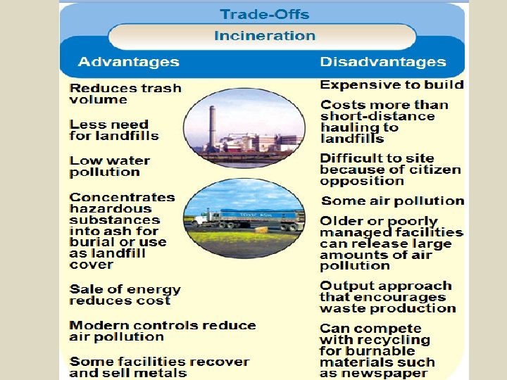 Trade-Offs Plasma Arc Advantages Small Disadvantages High cost Produces CO 2 and CO Mobile. Easy to move to different sites Produces no toxic ash Can release particulates and chlorine gas Can vaporize and release toxic metals and radioactive elements Fig. 22 -19, p. 538