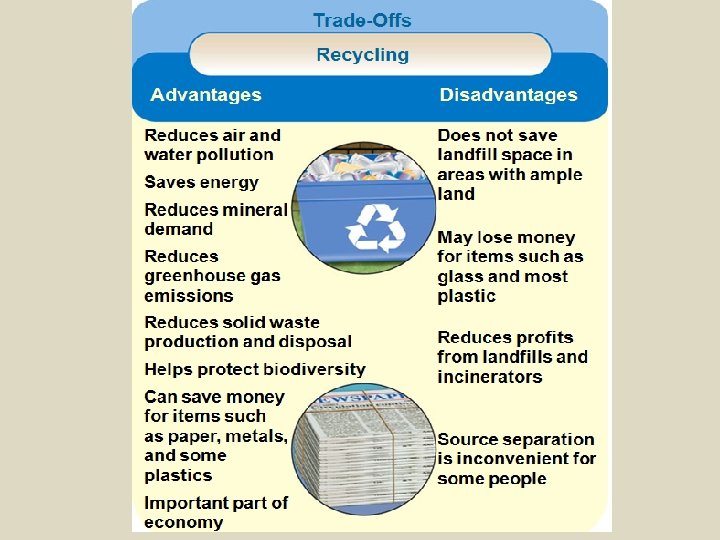 Solutions: mimic nature 1. Consume less 2. Redesign manufacturing processes and products to: use less material and energy create less pollution and waste 3. Develop products that are easy to repair, reuse, recycle, or compost “cradle to cradle” 4. Eliminate or reduce packaging material 5. Charge fee-per-bag for trash collection, but free recycle collection 6. Establish cradle to grave responsibility laws