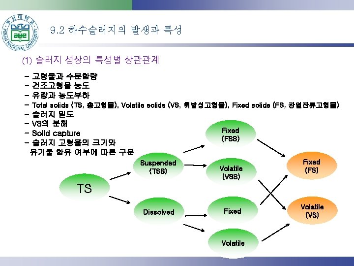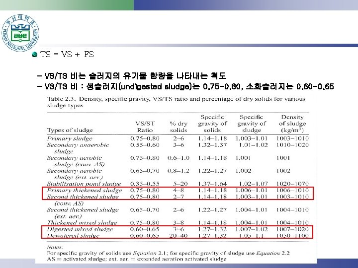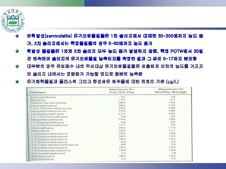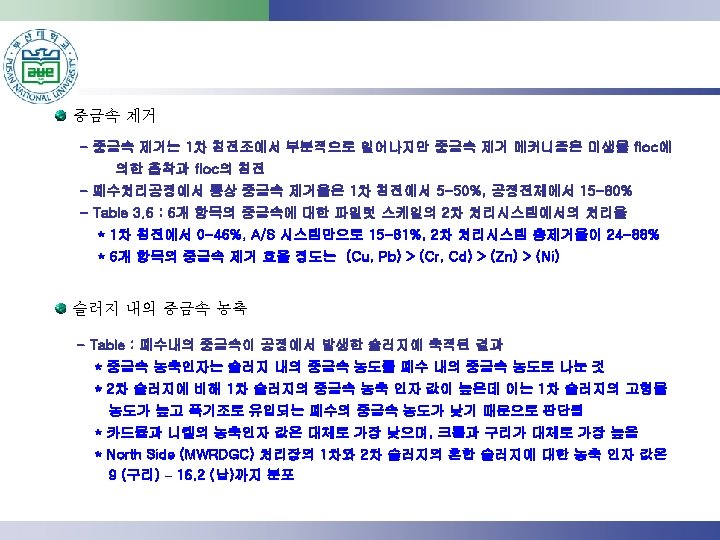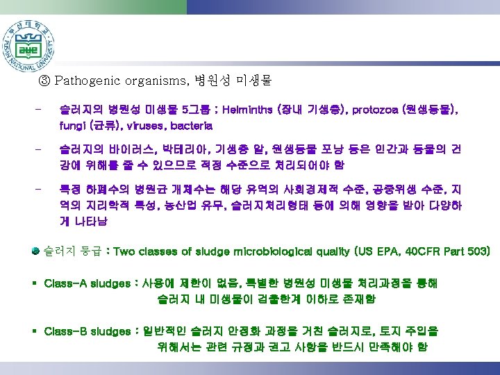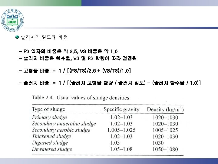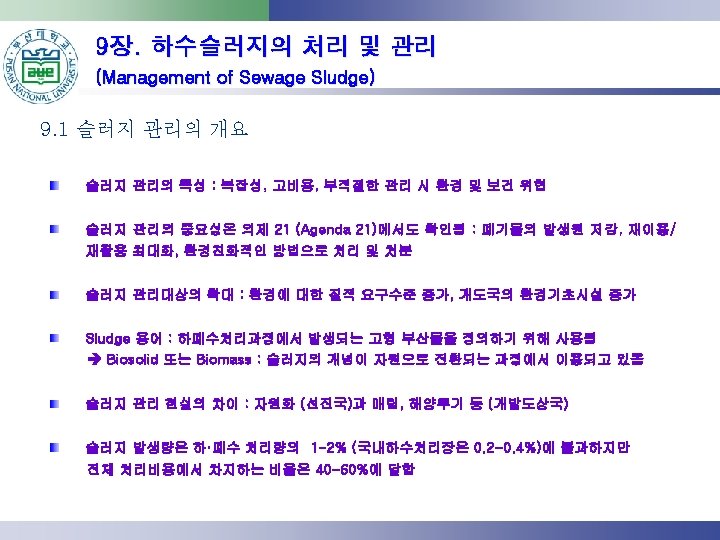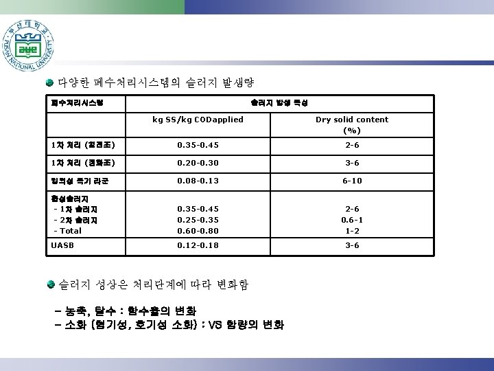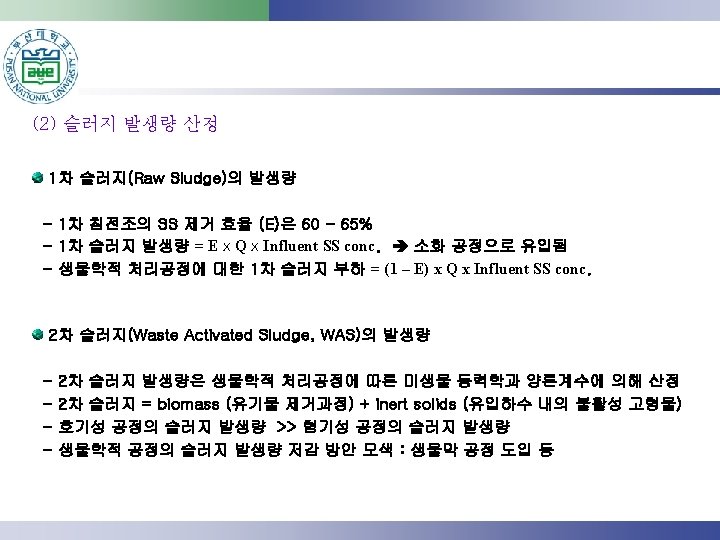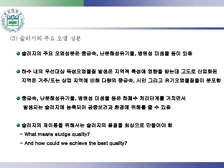 슬러지 관리의 주요 내용 (Main topic of sludge management) Main topic Item covered Sewage sludge: characteristics and production - Sludge production in wastewater treatment plants Fundamental relationships among variables Sludge production estimates Mass balance in sludge treatment Main sludge contaminants - Metals Pathogenic organisms Organic contaminants Discharge of effluents into public sewerage systems Sludge stabilization process - Anaerobic digestion - Aerobic digestion Removal of the water content from sewage sludges - Sludge thickening Sludge conditioning Drying bed/thermal drying Centrifuge Filter/belt press