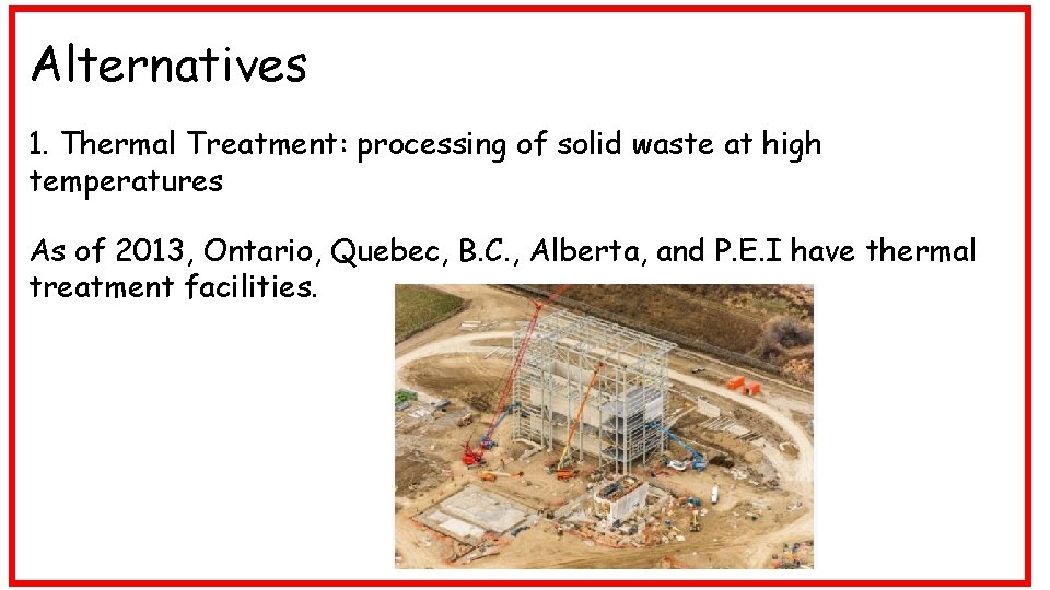 Alternatives 1. Thermal Treatment: processing of solid waste at high temperatures As of 2013, Ontario, Quebec, B. C. , Alberta, and P. E. I have thermal treatment facilities.
