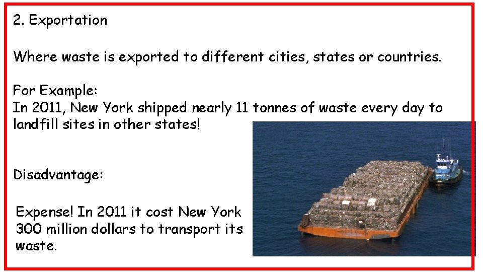 2. Exportation Where waste is exported to different cities, states or countries. For Example: In 2011, New York shipped nearly 11 tonnes of waste every day to landfill sites in other states! Disadvantage: Expense! In 2011 it cost New York 300 million dollars to transport its waste.