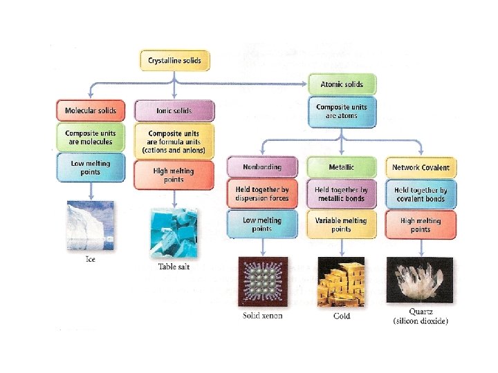 the structure of solids crystalline solids Amorphous solids Are those whose particles molecules or ions have an ordered arrangement Are those whose particles are randomly arranged and have no ordered long range structure Like rubber crystalline solids Molecular solids Ionic solids Network covalent solids Metallic solids Are those whose constituent particules are molecules held together by intermolecular forces like ice, sucrose Whose particules are ions Na. Cl Whose atoms are linked by covalent bonds in three dimension Diamond graphite In which the structural units are electrons and cations like Ag, Fe