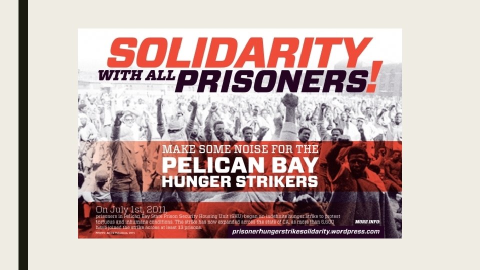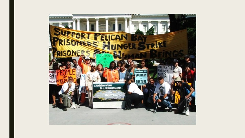 Racial Disparities in the SHU ■ In the New York City jail system (2011 -13), African Americans were 2. 52 times more likely than whites to be put in solitary. Hispanics were 1. 65 times more likely. ■ In 2011, 85% of the prisoners in California’s Pelican Bay SHU were Latino, compared to only 41% of prisoners in the general prison population. ■ In Washington, D. C. (2014), 97% of men in administrative segregation — one type of solitary confinement — were black. ■ Mental illness and cognitive impairment is more likely to be interpreted as “bad” or “manipulative” behavior in black and brown prisoners. See, for example, Jonathan Metzl’s research on race and mental illness (The Protest Psychosis).