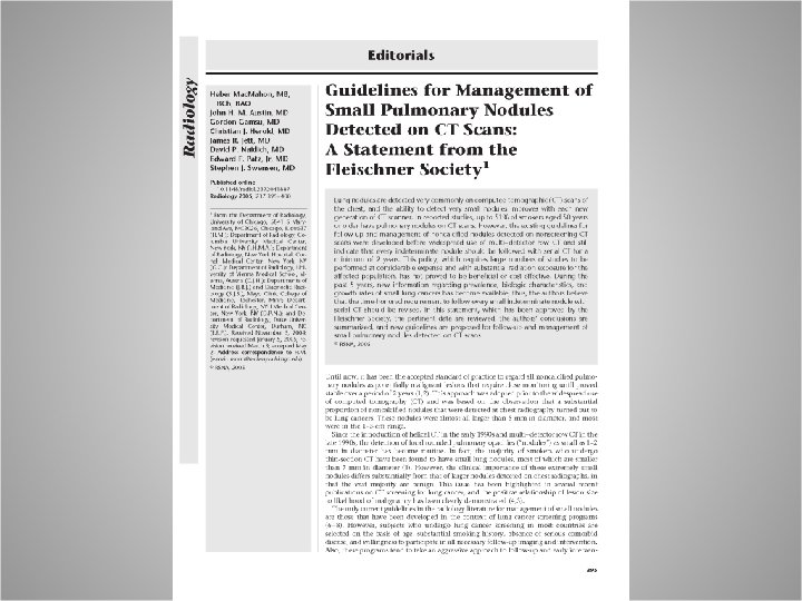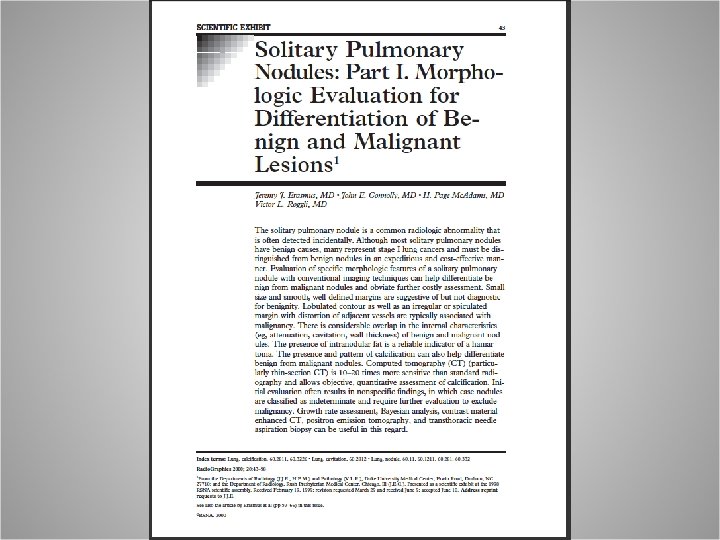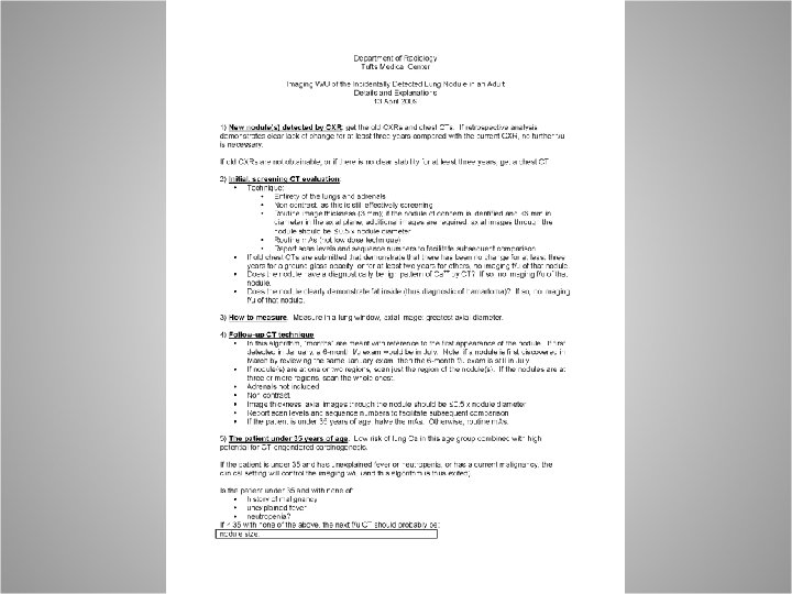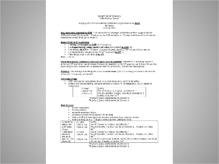 Growth Rate • • • The limit of detectable changes on CXR is estimated to be 3– 5 mm. CT has a resolution of << 1 mm. Thus, it is reasonable to use two-year stability on CT as a practical guideline for solid nodules, and 3 years for partially solid or fully ground-glass nodules.