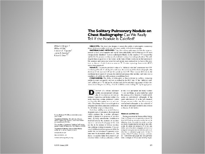 Solitary Pulmonary Nodule • • • “Coin lesion” Defined as < 3 cm Completely surrounded by lung parenchyma