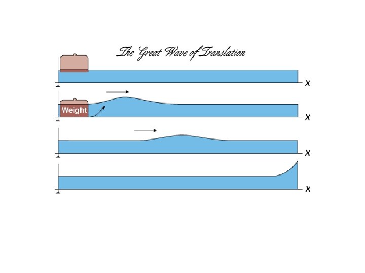 Great Wave of Translation “I was observing the motion of a boat which was rapidly drawn along a narrow channel by a pair of horses, when the boat suddenly stopped - not so the mass of water in the channel which it had put in motion; it accumulated round the prow of the vessel in a state of violent agitation, then suddenly leaving it behind, rolled forward with great velocity, assuming the form of a large solitary elevation, a rounded, smooth and well-defined heap of water, which continued its course along the channel apparently without change of form or diminution of speed…” - J. Scott Russell