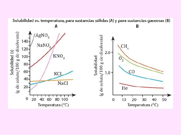 Gráficas de la solubilidad de diferentes sustancias en agua • Como vemos, la solubilidad no aumenta siempre con la temperatura, ni varía de manera lineal.