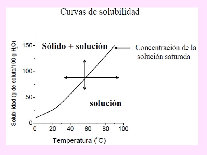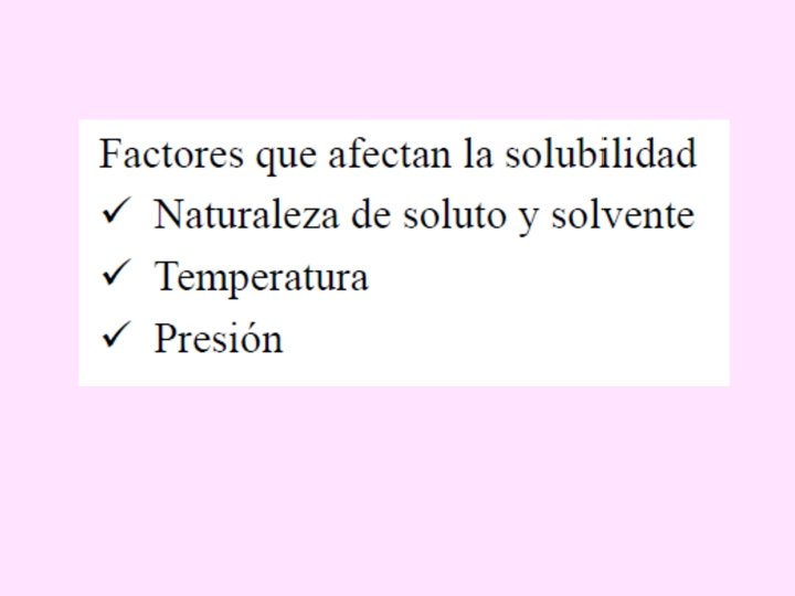 SOLUBILIDAD DE SÓLIDOS EN LÍQUIDOS En general la solubilidad de un sólido aumenta con la temperatura y sólo algunas sustancias disminuyen su solubilidad. Si el soluto es un sólido iónico, el aumento de la temperatura provoca un aumento en la solubilidad de éste.