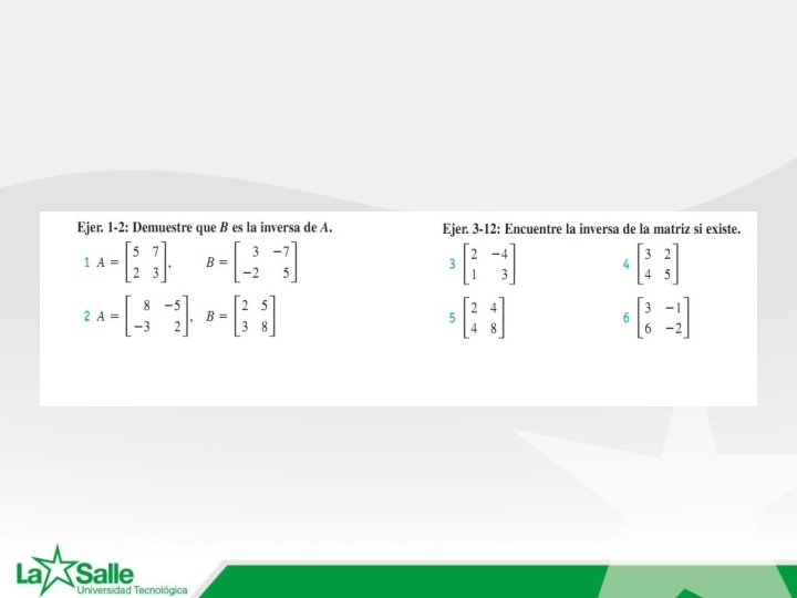 Matriz triangular inferior y superior Si todos los elementos por arriba de la diagonal son ceros, la matriz se denomina triangular inferior y triangular superior cuando todos los elementos por debajo de la diagonal son ceros: 1 4 − 2 0 6 1 0 1 − 3 0 y 0 − 1 − 4 0 0 3 0 1