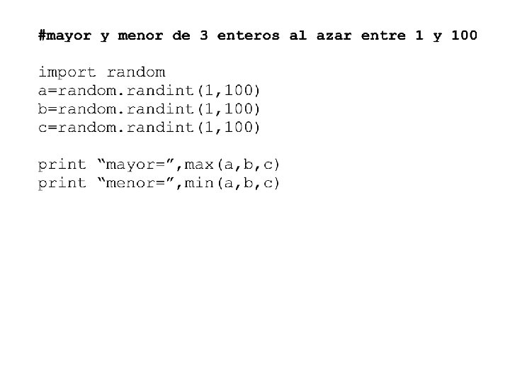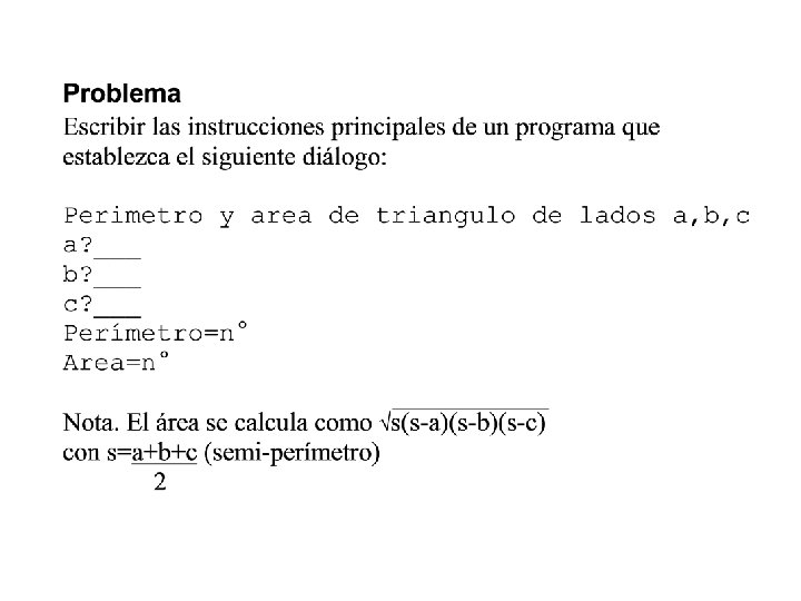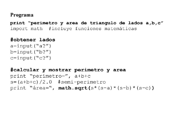 Soluciones de ejercicios 1 y 2 print “Calcular área y perímetro de círculo” r=input(“radio? “) print “área=“, 3. 14*r**2 print “perímetro=”, 2*3. 14*r print ”ingresar nº alumnos de colegios: ” a=input(“públicos? ”) b=input(“subvencionados? ”) c=input(“particulares? ”) factor=100. 0/(a+b+c) print “públicos=“, a*factor, ”%“, print “subvencionados=“, b*factor, ”%“, print “particulares=“, c*factor, ”%“