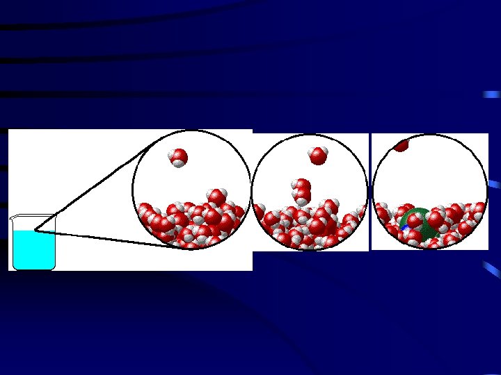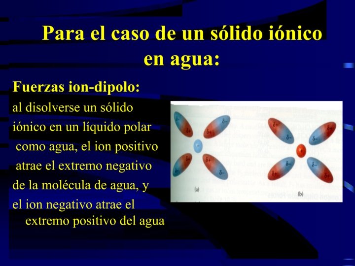 ¿Qué sucede a nivel molecular para que se forme una solución? • La fuerzas de atracción entre las moléculas del soluto y las moléculas del disolvente son tan o más fuertes que las fuerzas de atracción entre las moléculas del soluto mismas y las fuerzas de atracción entre las moléculas del dislvente mismas.