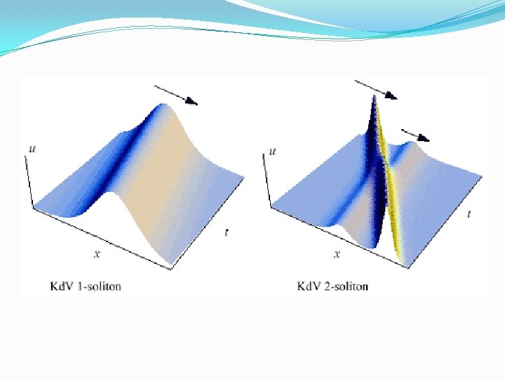 Zabusky y Kruskal � En 1965 Norman Zabusky, de los Bell Lab, y Martin Kruskal, de Princeton, trabajaron numéricamente una discretización de la ecuación de Kd. V. Descubrieron la existencia de un tipo de ondas localizadas muy especiales, que exhibían un comportamiento tipo partícula. Es decir, cuando dos de estas ondas interactúan, salen de la colisión con su identidad intacta, y solamente con un pequeño cambio de fase. Las llamaron ondas solitrónicas, pero como este término ya se usaba en patentes industriales, tomaron el nombre de solitones. Este término fue elegido para estar en concordancia con el nombre de las partículas elementales, tales como electrón, protón, fotón, etc. � Como un comportamiento tipo partícula era inusual en ondas no lineales, y sus colegas buscaron entender a estos solitones. Como resultado de sus esfuerzos, dos años más tarde encontraron un método para resolver la ecuación Kd. V, que explicaba la dinámica del solitón.