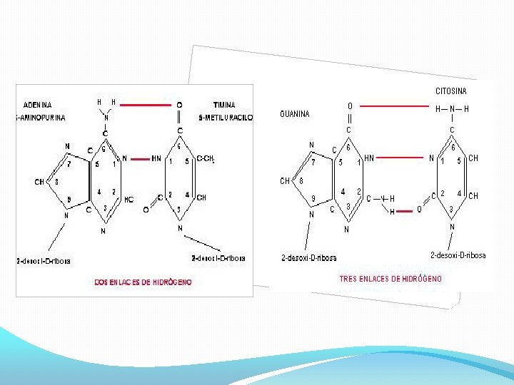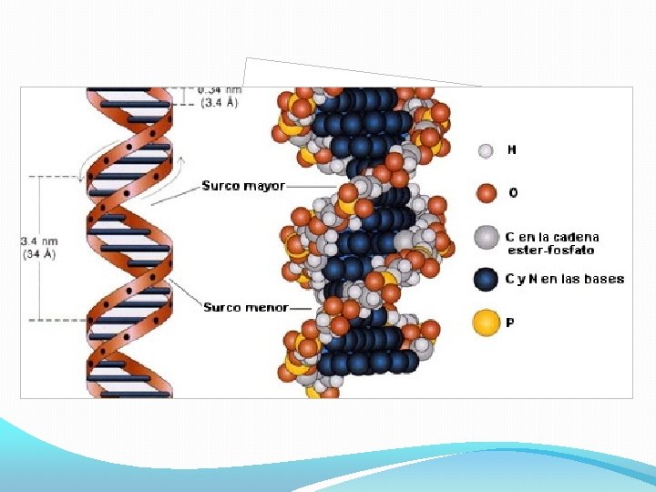 Molécula del ADN �El ADN es un polímero, compuesto de unidades denominadas nucleótidos. �Un nucleótido está hecho de un grupo fosfato + un azúcar + una base nitrogenada. �El ADN está formado de dos cadenas o hebras dextrógiras enrolladas alrededor de un eje formando una hélice doble de 20 A° de diámetro ("la doble hélice").