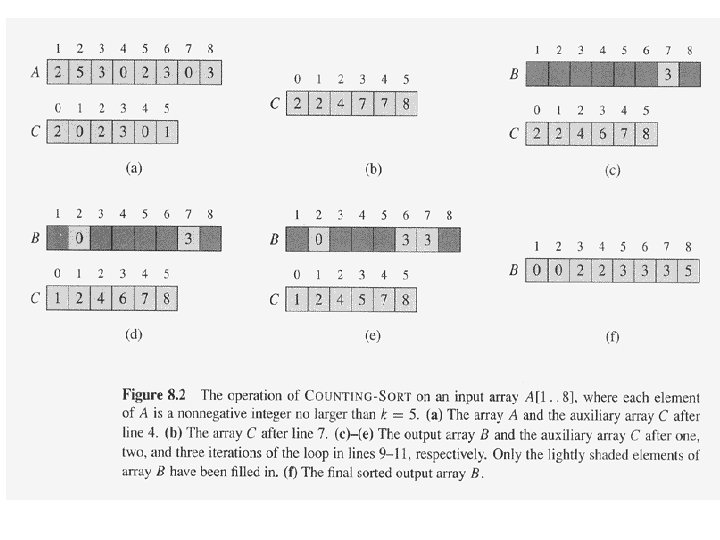 Counting Sort – No comparisons between elements! – But…depends on assumption about the numbers being sorted • We assume numbers are in the range 1. . k – The algorithm: • Input: A[1. . n], where A[j] {1, 2, 3, …, k} • Output: B[1. . n], sorted (notice: not sorting in place) • Also: Array C[1. . k] for auxiliary storage