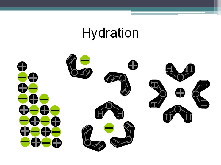 The breaking part of compounds into the ions that created them is called dissociation. Na. Cl(s) dissociates into 1 Na+1(aq) and 1 Cl-(aq) Na. Cl(s) 1+ Na (aq) + Cl (aq) Ca. Cl 2(s) dissociates into 1 Ca 2+(aq) and 2 Cl-(aq) Ca. Cl 2(s) Ca 2+(aq) + 2 Cl-(aq) The process of dissolving a solute with a solvent is called solvation. The process of dissolving a solute with water as the solvent is called hydration.
