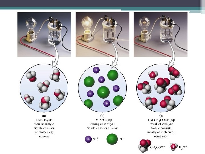 Solutions of strong electrolytes conduct electricity well. The solutes of these solutions typically have broken down into their ions, and thus there are many ions to conduct the electricity. Solutions of weak electrolytes will conduct electricity slightly. The solutes of these solutions typically have only partly broken down into their ions; having few ions to conduct the current. A non-electrolyte is a substance that dissolves in water to give a solution that does not conduct an electric current. A solution of a non-electrolyte will not conduct electricity. These solutes remain in their molecular form with no ions present in the solution.