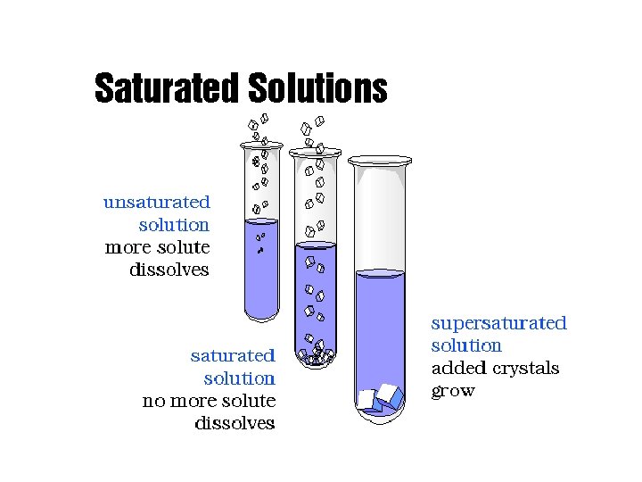 • Saturated solution - a stable solution in which the maximum amount of solute has been dissolved. • Unsaturated solution - a solution that contains less solute than a saturated solution under existing condition • Supersaturated solution - a solution that temporarily contains more than the saturation amount of solute than the solvent can hold (unstable)