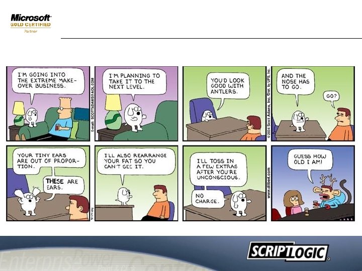 IT Staff Freed Up to Focus on Business & IT Strategic Issues Roll-out, consolidate, manage: n n n n Before Script. Logic New Outlook profiles Security policies & services New printer drivers Complex AD issues Drive mapping Proxy settings Service Packs n Plan New Server Rollout n Test Back-up & recovery process n Test new software applications After Script. Logic