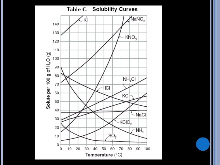 INTERPRETING SOLUBILITY CURVES 1. What is the maximum amount of Na. NO 3 that will dissolve in 100 g of water at 10 o. C? 2. At what temperature will 70 g of NH 4 Cl dissolve in 100 g of water? 3. Which substance has the greatest solubility at 0 o. C? 4. Which substance is the least soluble at 100 o. C? 5. 15 g of KCl. O 3 is dissolved in 100 g of water at 50 o. C. Is the solution saturated, unsaturated, or supersaturated?