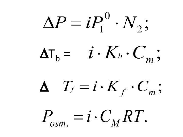 The Second Raoult's law • Increasing boiling point ( Tk ) and lowering freezing point ( Tз) of solutions are proportional to the molality of a solution. Tb = Кb • Cm; Tf = Kf • Cm Кb - molal boiling-point elevation constant; Сm - molality, mole/Kg Кf - molal freezing-point depression constant For water Кb = 0, 52 ; Кf = 1, 86