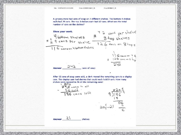 Let’s try it out… Part A: A grocery store had cans of soup on 7 different shelves. The bottom 4 shelves each had 29 cans. The top 3 shelves each had 42 cans. What was the total number of cans on the shelves? Part B: After 56 cans of soup were sold, the clerk moved the remaining cans to a display case. The display case had shelves that could each hold 9 cans. How many shelves were needed to fit all the remaining cans?