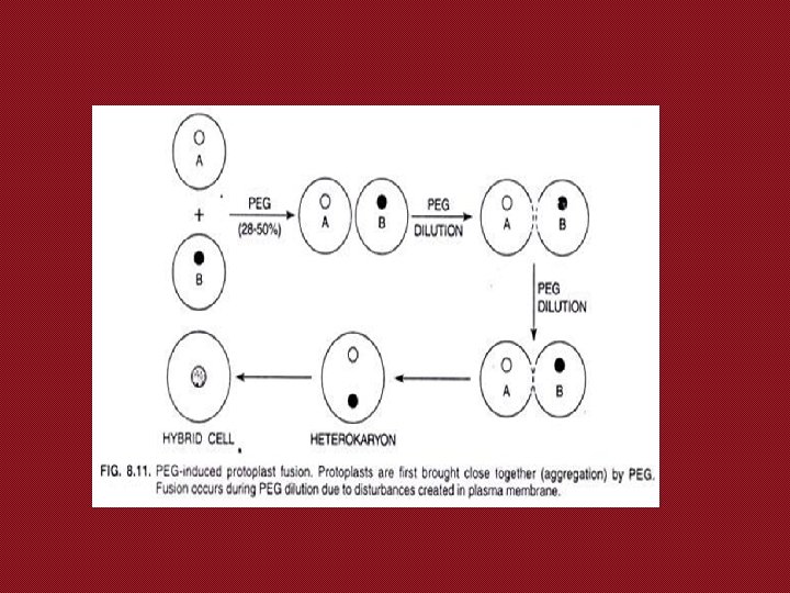 Fusion of the protoplasts of desired species/varieties • Polyethylene glycol (PEG) induced protoplast fusion is the most commonly used as it induces reproducible high frequency fusion accompanied with low toxicity to most cell types. The protoplast mixture is treated with 28 -50% PEG (MW 1, 500 -6, 000) for 15 -30 min, followed by gradual washing of the protoplasts to remove PEG; protoplast fusion occurs during the washing.