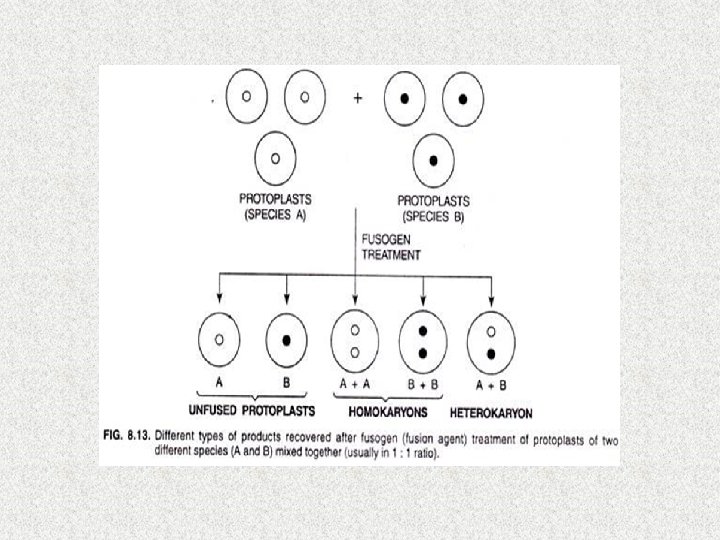 Selection of Hybrid Cells The protoplast suspension recovered after a treatment with a fusion inducing agent (fusogen) consists of the following cell types: (i) unfused protoplasts of the two species/strains, (ii) products of fusion between two or more protoplasts of the same species (homokaryons), (iii)‘hybrid’ protoplasts produced by fusion between one (or more) protoplast(s) of each of the two species (heterokaryons)