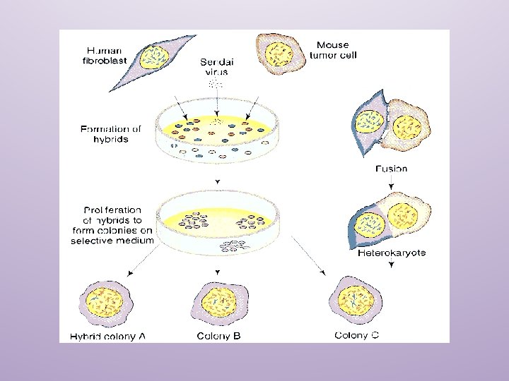 APPLICATIONS IN ANIMAL CELLS 1. Hybrid cells are used to study the gene expression. 2. Hybrid cells are used to study the basics of cell division 3. Hybrid cells can be used to study the transformation of normal cells into malignant cells. 4. Hybrid cells are used to obtain viral replication 5. Hybrid cells are used for chromosome or gene mapping 6. Hybrid cells are also used in the production of monoclonal antibodies
