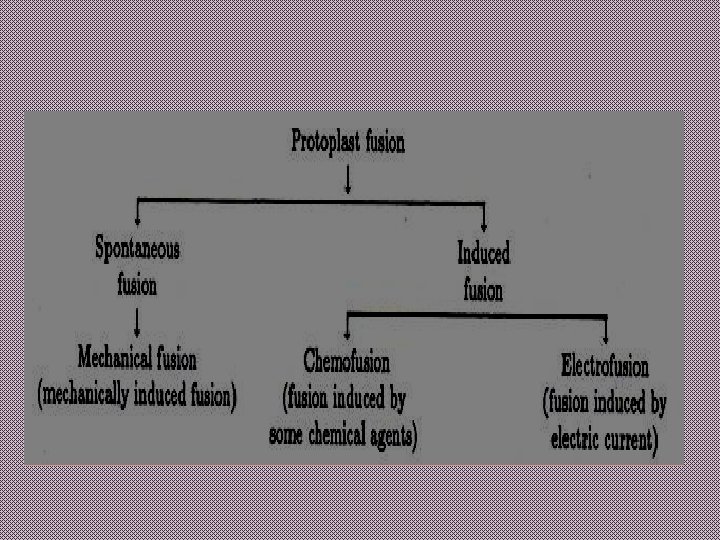Types of protoplast fusion : 1) Spontaneous fusion: Spontaneous fusion also known as mechanical fusion is the type of fusion in which the two protoplasts are fused together by bringing them closer and disrupting their cell membranes. 2) Induced fusion : induced fusion is the type of fusion in which either chemical agents (I. e chemofusion) or electric current (I. e electrofusion) is used to fuse the two protoplasts.