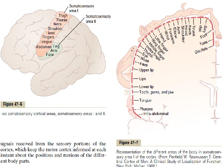 Functions of Somatosensory Area I • The person is unable to localize discretely the different sensations in the different parts of the body. However, he or she can localize these sensations crudely, such as to a particular hand, to a major level of the body trunk, or to one of the legs. Thus, it is clear that the brain stem, thalamus, or parts of the cerebral cortex not normally considered to be concerned with somatic sensations can perform some degree of localization. • The person is unable to judge critical degrees of pressure against the body. • The person is unable to judge the weights of objects. • The person is unable to judge shapes or forms of objects. This is called astereognosis. • The person is unable to judge texture of materials because this type of judgment depends on highly critical sensations caused by movement of the fingers over the surface to be judged.