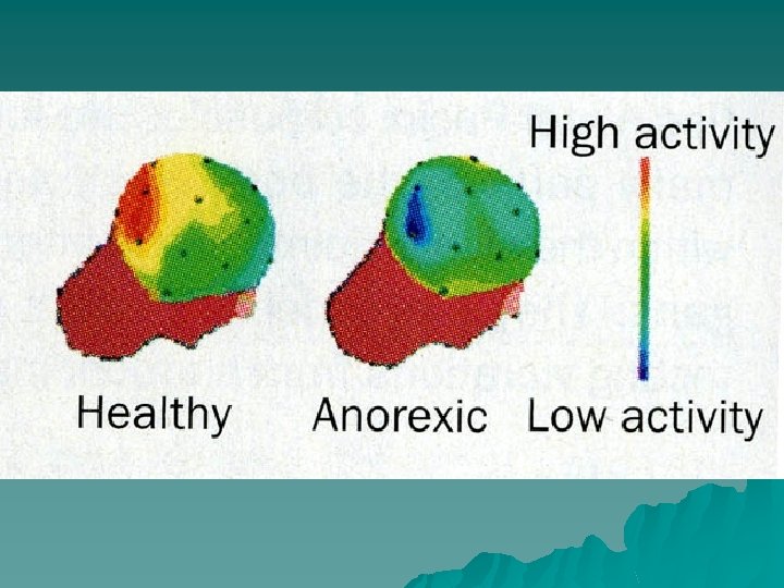 Eating Disorders u Bulimia – binge eating followed by either u purging u excessive exercise – Can be any weight u about 5% of high school females u about 14% of college females (seniors) u often appears with depression