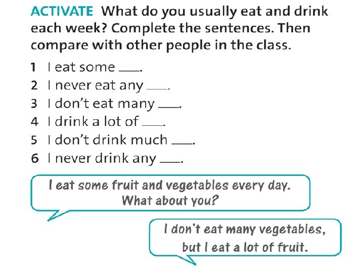 Napiši stavke, tako da uporabiš besedo v oklepaju. (many) I don’t usually eat many vegetables. I know they’re healthy, but I don’t like them! • (much) ______________________ • (some) ______________________ • (any) ______________________ • (a lot of) ______________________