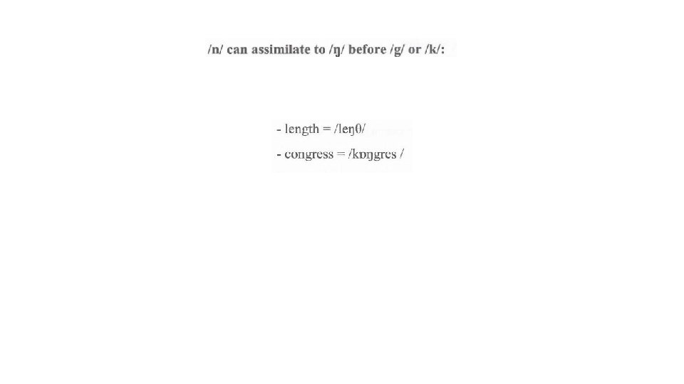 Place of Articulation Assimilation • This type of assimilation involves the change of the place of articulation of the consonants involved in assimilation. • /n/ in prefix –in becomes /m/ when attached to possible impossible