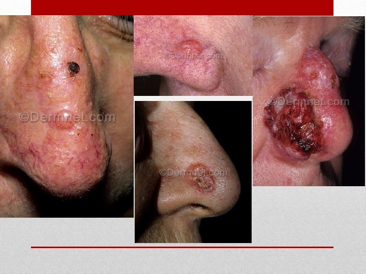 • • • Waxy papules with central depression Pearly appearance Erosion or ulceration, often central Bleeding, especially when traumatized Crusting Rolled (raised) border Translucency Telangiectases over the surface Slow growing (0. 5 cm in 1 -2 y) Chracteristic features