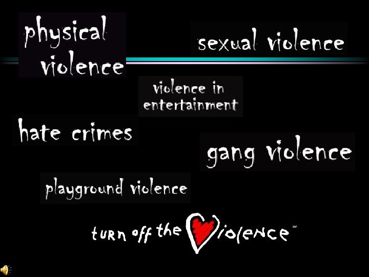 3. Turn Off the Violence ADDRESSES ALL FORMS OF VIOLENCE. As a coalition, Turn Off the Violence asks people to turn off violence in all its ugly forms -- physical violence, sexual violence, verbal violence, violence in entertainment, family violence, gang violence, hate crimes, and playground violence.