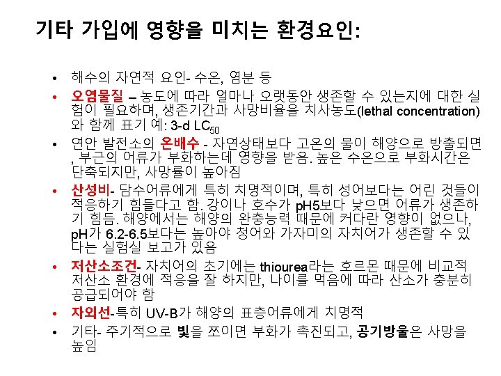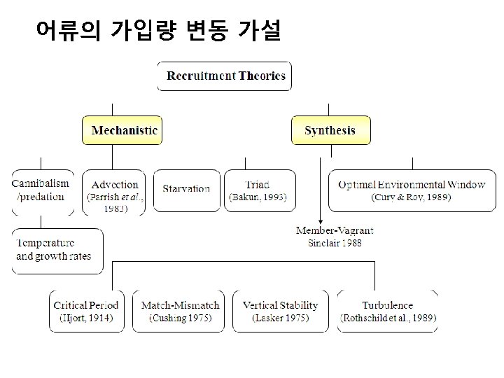 Recruitment theories (Cole & Mc. Glade, 1998) • 크게, 어떤 특정 메카니즘에 의해 가입량이 결정된다는 기계 론적 이론(mechanistic theories)과 여러 가지 메카니즘이 함 께 작용하는 통합적 이론(synthesis theories) 있음. • Mechanistic - deal with specific sources of egg and larval mortality. • 기작 규명 접근 가설의 예: - Cushing의 match-mismatch가설 - Lasker의 stability가설 - transport 가설 - 기타 (turbulence effect 등) • Synthesis - attempt to unite the various mechanistic theories within a larger framework.