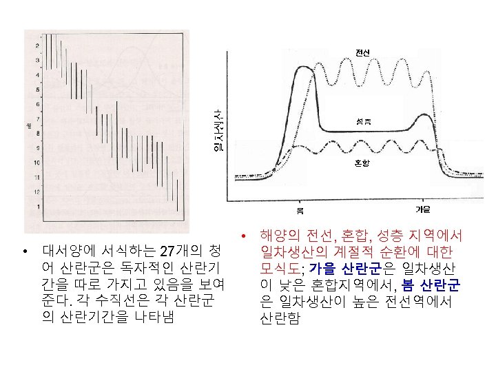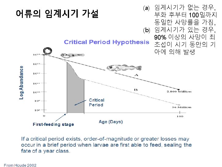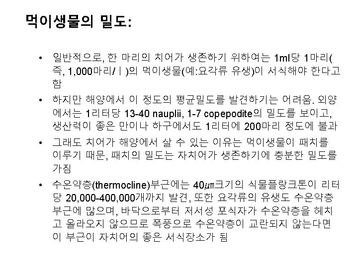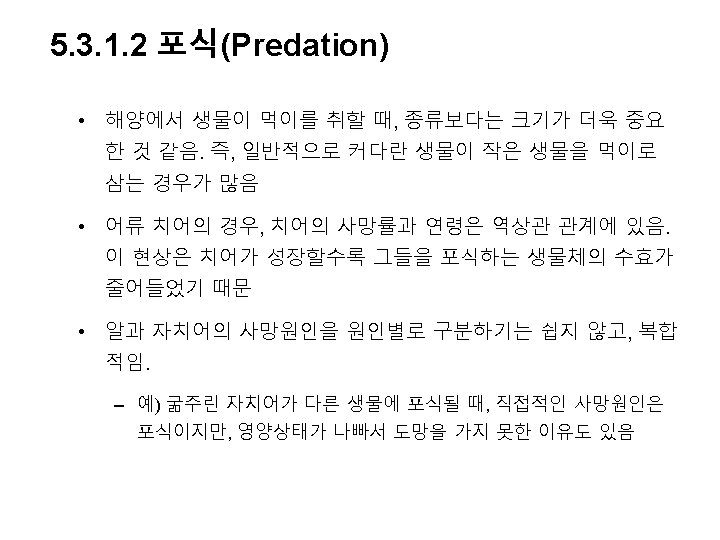 5. 3. 1 Mechanistic theories (1) Starvation ① Critical period (Hjort, 1914): earliest larval stages: lack of prey item during a “critical period” (Cushing, 1996): later larval stages –most critical ② Match-mismatch theory (Cushing, 1975, 1976): temperate regions where discontinuous production occurs; (north-east Atlantic and North Sea); Reproductive success depends on the amount of time and abundance; overlap between larval production and larval food production ③ Stability hypothesis (Lasker, 1975, 1978): stable ocean hypothesis; spatial overlap of larvae and food; upwelling area, pelagic fish; thermoclines and maximum chlorophyll layers (MCL) ④ Turbulence (Rothschild et al. , 1989; Rothschild, 1991); encounter rate between larvae and food particles