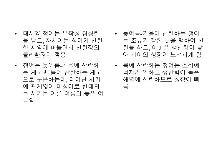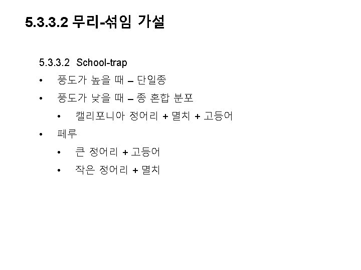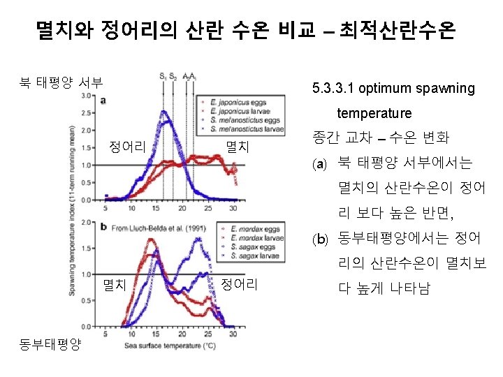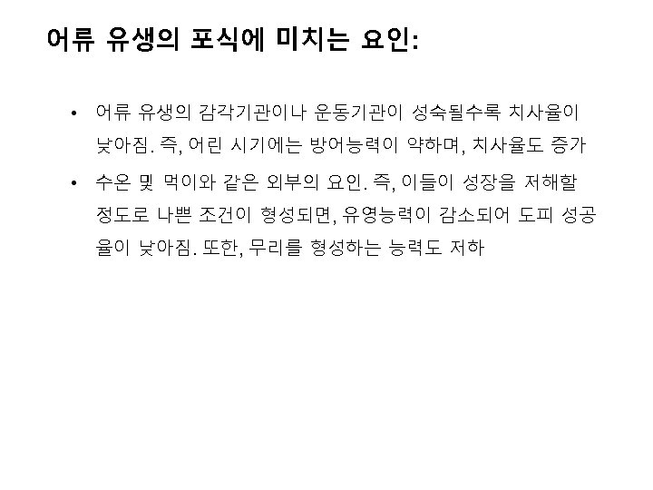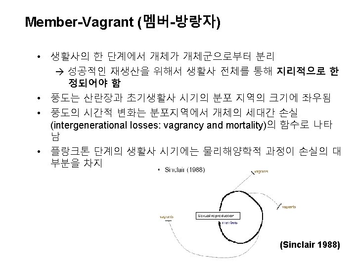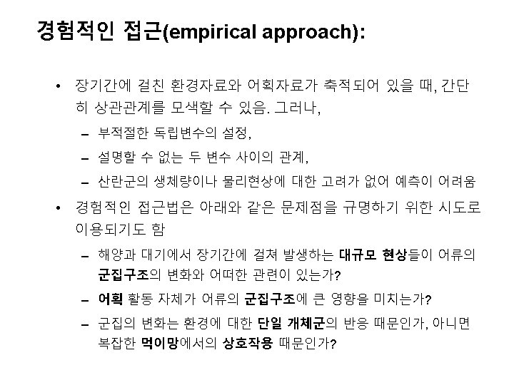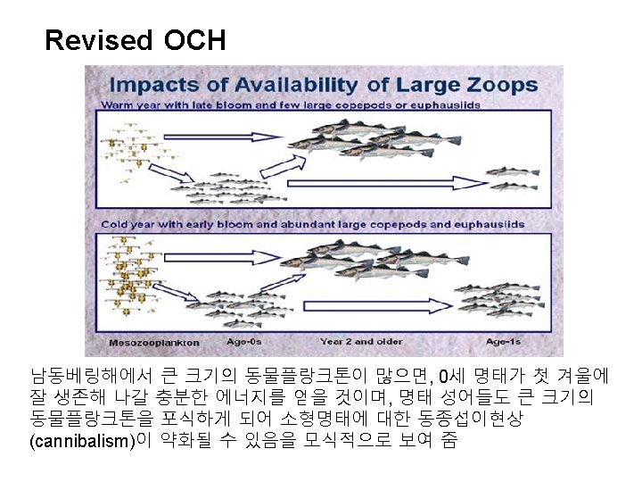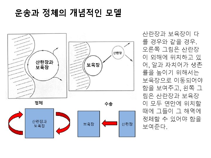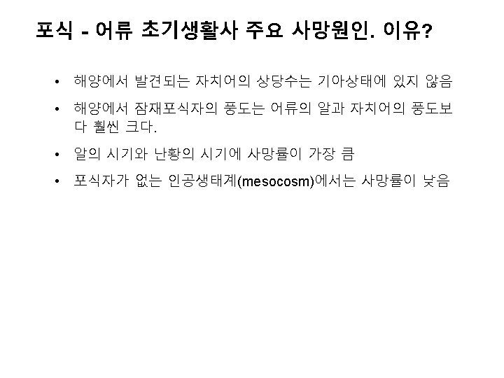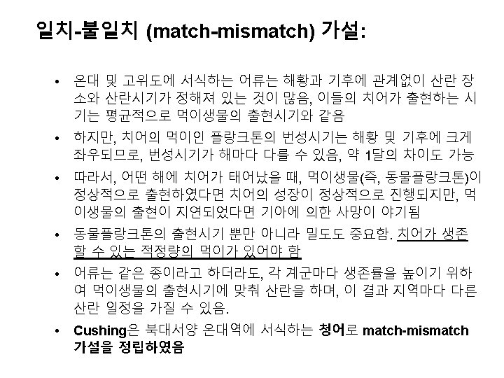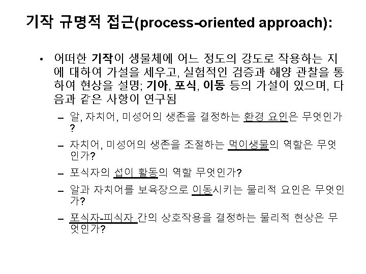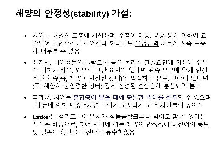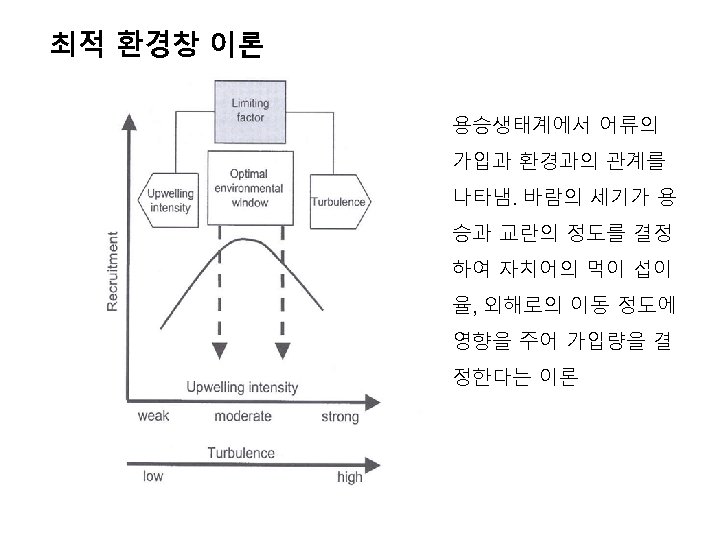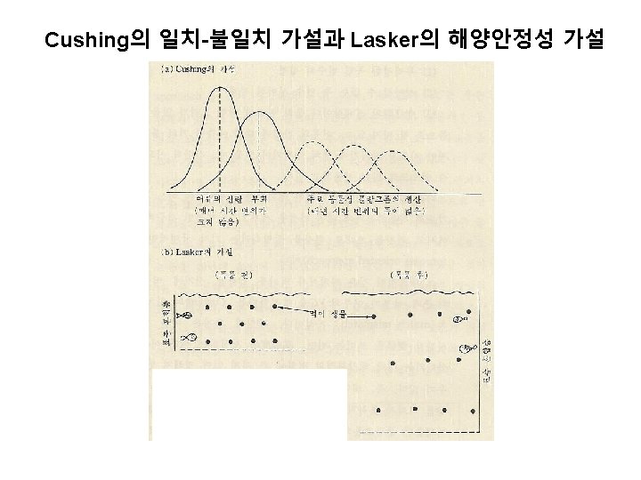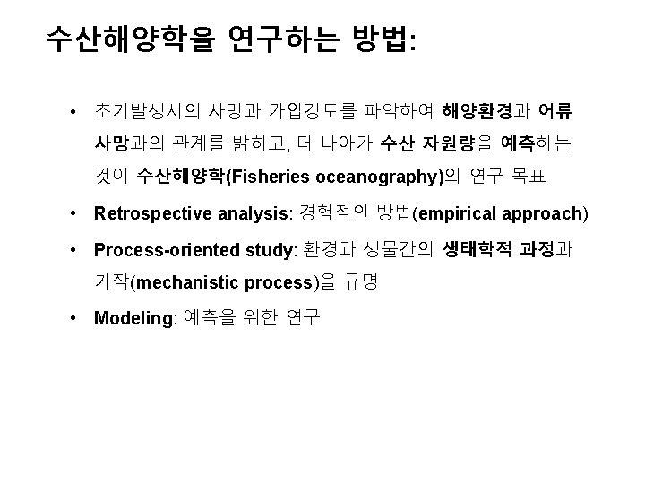 Mechanistic theories (continued) 2) Advection (offshore transport-retention theory) – Hjort (1914): offshore transport hypothesis, density independent mechanism – Iles and Sinclair (1982) – Transport of eggs and larvae towards or away from suitable nursery areas – Upwelling area – Clupeiods tend to avoid spawning in areas and at times with strong upwelling (Parrish et al. , 1983) – Member-vagrant hypothesis (Sinclair, 1988), “The Herring Hypothesis” emphasize retention for survival 3) Cannibalism/predation – 70년대 이전까지는 기아 가설이 우세하였으나, 80년대부터 포식 가설이 더 힘을 받고 있음.